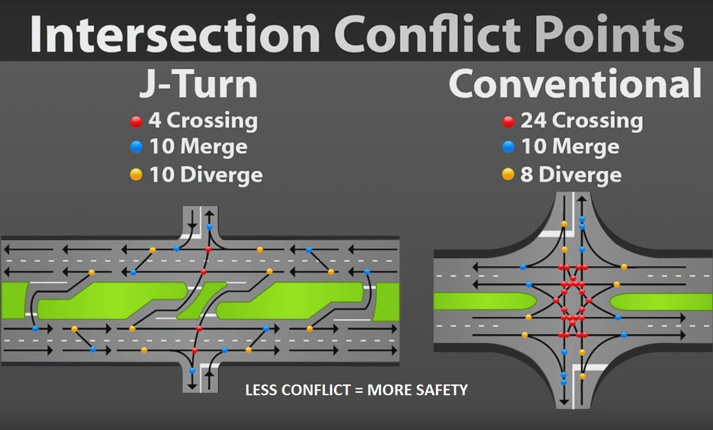 J-turn (also called RCUT) intersections reduce the risk of serious crashes by minimizing conflict points at the intersection. This will eliminate the need for motorists to cross oncoming traffic from two lanes in two different directions. Once the project is completed, motorists will need to cross only one direction of traffic at a time.