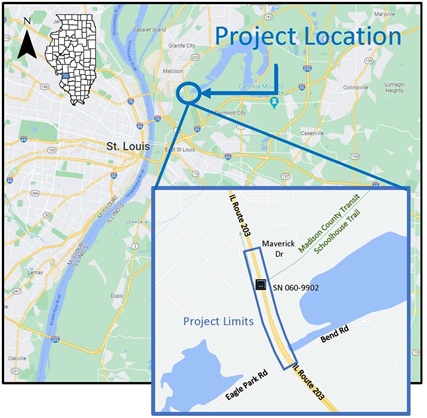 The Illinois Department of Transportation (IDOT) is performing a Phase I Engineering and Environmental Study for potential improvements along IL Route 203 between Maverick Drive and Eagle Park Road in Madison County. The one-mile study area includes the bridge that carries the Schoolhouse Trail over IL Route 203, creating a viaduct and low-point drainage condition supported by a pump station.