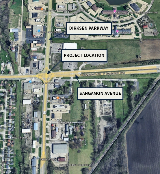 IDOT’s scope for this project includes reconstructing the intersection of Sangamon Avenue and Dirksen Parkway to accommodate dual left-turn lanes in all directions, as well as dual right-turn lanes for westbound Sangamon Avenue turning onto northbound Dirksen Parkway. Additional right-turn lane storage will be provided, and medians will be installed in all directions to help manage traffic flow and enhance safety.