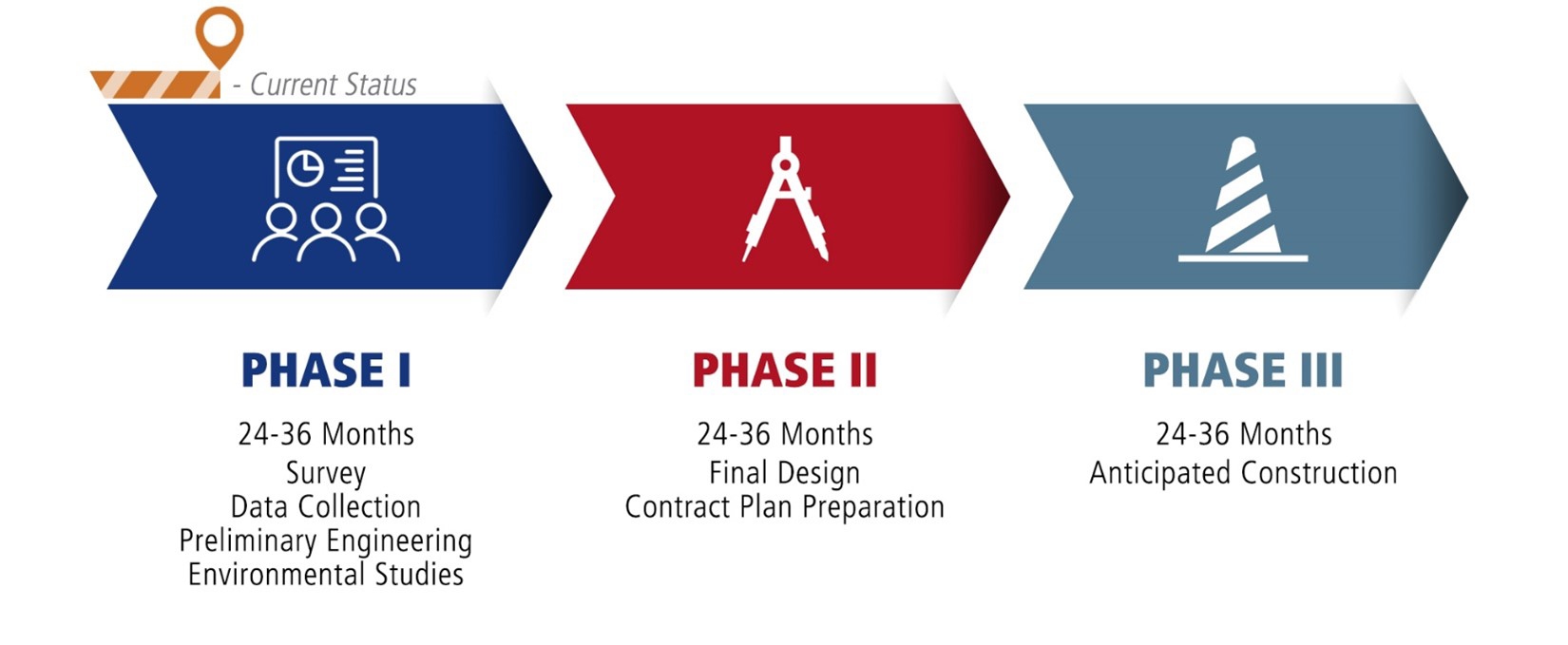 We are currently in the early stages of Phase I, with the project team collecting data and beginning their initial evaluation and analysis. The project team will analyze the existing bridges, road and ramps within the project limits to determine the appropriate repairs. Initial work will include preliminary design and construction cost estimates. New bridge deck surfaces, road safety improvements, and drainage improvements will be analyzed in the Phase I study. A plan for staging and work zone traffic control will be investigated.