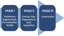 Phase II is the design and land acquisition stage in the project process. After a preferred alternative receives Design Approval, plans are developed and required right of way is acquired. Phase II typically takes 18-24 months to complete.