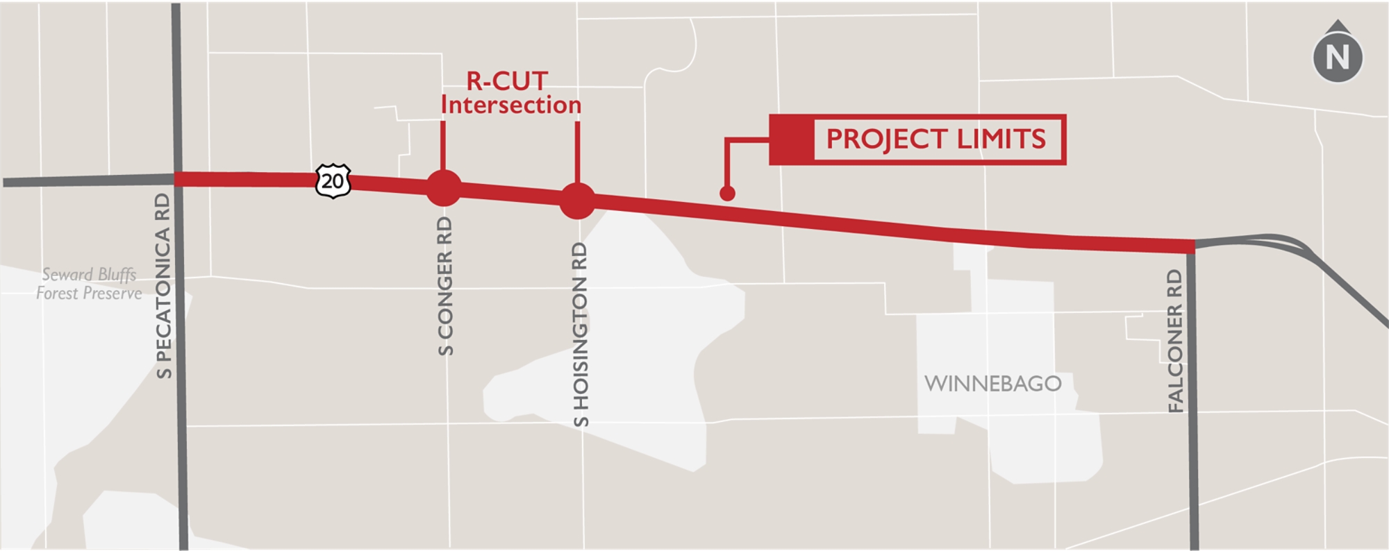 As a part of the pavement reconstruction scope, crash data has been studied along this corridor and has identified two intersections that would benefit from geometric safety improvements that include the installation of Restricted Crossing U-Turn Intersections (RCUT). The proposed roadway geometrics will restrict through and left turn movements at U.S. 20’s intersections at Conger Road and Hoisington Road.